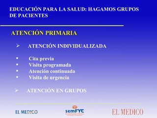 El documento propone la creación de grupos de pacientes con problemas crónicos de salud para mejorar el control de la enfermedad, evitar complicaciones, mejorar la calidad de vida y reducir la presión asistencial. Explica las ventajas del trabajo en grupo y ofrece recomendaciones sobre la estructura, planificación, dinámicas y técnicas a utilizar por el coordinador para hacer efectivos estos grupos de pacientes.