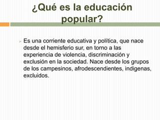 La educación popular es una corriente educativa que nace desde los grupos marginados y excluidos en América Latina. Se caracteriza por construir conocimientos a partir de las experiencias de los sujetos y no es un sistema estático. Paulo Freire fue uno de sus principales exponentes y propuso un método basado en el diálogo crítico y la concientización para empoderar a los oprimidos. El proceso de educación popular involucra etapas de reconocimiento crítico de la realidad, comprensión para actuar de forma transformadora y cambio de pr