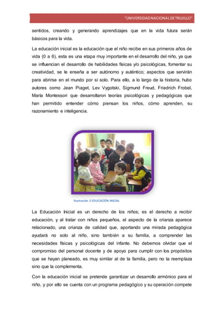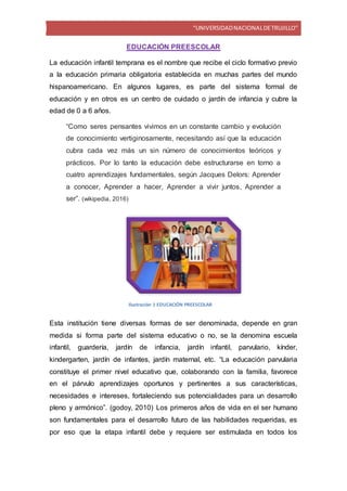 La educación preescolar se refiere a la educación de niños de 0 a 6 años. Es una etapa importante para el desarrollo de habilidades físicas y psicológicas. Tiene diversas denominaciones como escuela infantil o jardín de infancia. Se divide en dos ciclos, de 0 a 3 años y de 3 a 6 años. Tiene como objetivo garantizar un desarrollo armónico del niño a través de programas pedagógicos. Se brinda en modalidades escolarizada y no escolarizada.