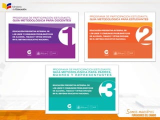 El documento presenta las lineas generales del Programa de Participación Estudiantil (PPE) en Ecuador, cuyo objetivo es desarrollar integralmente a estudiantes de primero y segundo año de bachillerato a través de la vinculación con la comunidad. El PPE ofrece tres ejes de educación: prevención contra el uso de drogas, educación ciudadana, y educación para el servicio a la comunidad. Incluye guías metodológicas para docentes, estudiantes y padres con el fin de abordar la prevención del consumo de dro