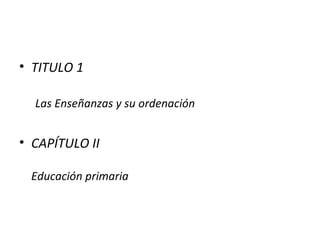 Este documento describe la educación primaria en España. Establece que la educación primaria dura 6 años, entre las edades de 6 y 12 años. Sus objetivos son permitir el desarrollo personal de los niños y niñas y enseñarles habilidades básicas como la lectura, escritura y cálculo. La educación primaria se organiza en áreas como lenguaje, matemáticas, ciencias sociales y naturales. Al final del segundo ciclo, los centros realizan una evaluación de diagnóstico de las competencias básic