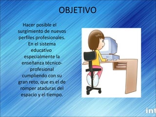 El documento describe la educación vía satélite, la cual tiene como objetivo hacer posible nuevos perfiles profesionales al romper las barreras del espacio y el tiempo. Participan conferencistas que exponen para un gran público a través de receptores de televisión o pantallas, permitiendo enviar preguntas a través de otros medios. La educación satelital ofrece educación complementaria a bajo costo pero con poca interacción. Organismos como el ILCE y Edusat proveen este servicio en Latinoamérica.