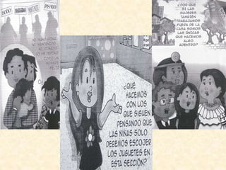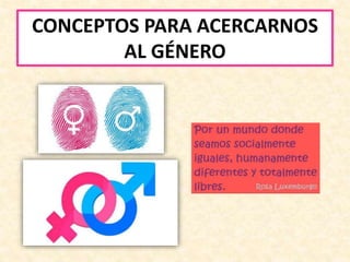 Este documento define conceptos clave relacionados con el género como identidad de género, roles de género, sexualidad y manifestaciones del sexismo. Explica que el género es una construcción social aprendida a través de la socialización y no biológica. También describe cómo se forman la identidad de género y los roles de género desde la niñez y cómo esto puede llevar a desigualdades. Concluye que se necesita igualdad real y efectiva entre hombres y mujeres para lograr una sociedad equitat