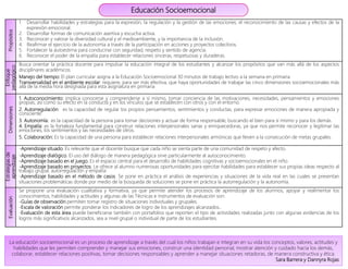 Este documento presenta los objetivos, enfoque, dimensiones y estrategias de la educación socioemocional. Los propósitos incluyen desarrollar habilidades emocionales, comunicación asertiva, reconocimiento cultural y autoestima. El enfoque busca orientar la práctica docente para lograr una educación integral. Las cinco dimensiones son autoconocimiento, autorregulación, autonomía, empatía y colaboración. Las estrategias de aprendizaje incluyen aprendizaje situado, dialógico, basado en j