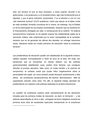 El documento analiza las tensiones en el sistema de educación superior chileno como producto de la falta de un rol socializador fuerte del Estado. Argumenta que las políticas neoliberales implementadas en las últimas tres décadas han privatizado la educación y debilitado su calidad, accesibilidad y financiamiento público, lo que ha afectado negativamente la educación desde niveles primarios hasta la universitaria.