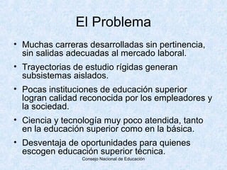 El documento propone reformar el sistema de educación superior para que sea más flexible y modular, permitiendo a las personas acceder a niveles más altos de educación a lo largo de su vida laboral. Esto requiere articular mejor la educación superior con las necesidades del mercado laboral, integrar todos los niveles de educación superior, dar más autonomía a las instituciones con accountability, y establecer una cultura de evaluación continua de la calidad.