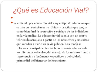 La educación vial se refiere a la enseñanza de conductas y conocimientos que promueven la seguridad y el cuidado en la vía pública, con un enfoque en la convivencia entre vehículos y peatones. Su objetivo principal es reducir accidentes y muertes en el tránsito mediante la sensibilización social, especialmente en jóvenes. La implementación de esta educación incluye el uso adecuado de señales de tráfico, el funcionamiento de semáforos y la importancia de la responsabilidad colectiva en el cumplimiento de las normas viales.