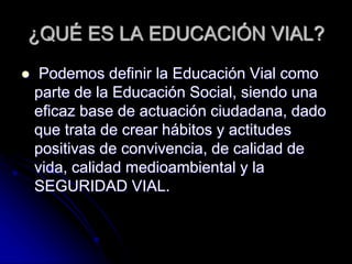 La educación vial se define como parte de la educación social que trata de crear hábitos y actitudes positivas de convivencia y seguridad vial. Según la OMS, los accidentes de tráfico causan 1,2 millones de muertes y más de 50 millones de heridos en el mundo cada año, siendo la principal causa de muerte de jóvenes de 10 a 24 años. La educación vial debe estar presente desde edades tempranas debido al fuerte protagonismo del tráfico en la sociedad y es necesaria para prevenir los accidentes viales y