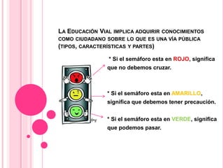 La educación vial implica adquirir conocimientos sobre las vías públicas, normas de circulación, señales de tráfico, factores de riesgo de accidentes, y comportamientos que fomenten la convivencia, tolerancia, solidaridad, respeto y responsabilidad. Existen diferentes tipos de señales como la demarcación horizontal, señalización luminosa y vertical, que indican la forma segura de circular y asignan el derecho de paso.