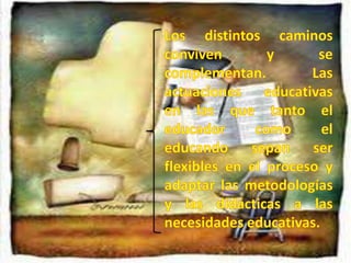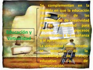 El documento describe diferentes aspectos de la educación virtual. Define el e-learning como un sistema de aprendizaje a través de medios electrónicos. Explica que existen diferentes tipos de e-learning como el 100% virtual, mixto o de apoyo, así como el mobile learning. También describe categorías como el e-learning síncrono y asíncrono, y diferentes modelos centrados en la tecnología, el profesor, el alumno, los contenidos e interacción entre iguales.