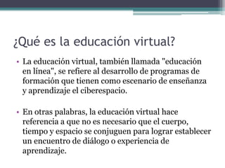 La educación virtual, también conocida como educación en línea, permite el aprendizaje sin la necesidad de encuentros físicos, apoyándose en tecnologías de la información y comunicación. Su historia se remonta a siglos pasados, pero ha evolucionado con la inclusión de herramientas digitales que facilitan el acceso a la educación. Existen tendencias como el blended learning y el conectivismo que redefinen la enseñanza, así como mitos que se desmienten, destacando su complementariedad con la educación presencial.