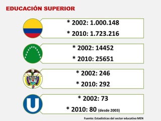 Este documento presenta un resumen de la educación virtual en América Latina y Colombia. En la región hay 175 instituciones que ofrecen programas virtuales con 164,527 estudiantes, concentrados principalmente en Brasil y México. En Colombia algunas universidades están desarrollando modelos educativos virtuales pero son pocas las alianzas entre ellas. Aún no existe un marco legal específico para la educación superior virtual en la mayoría de países.