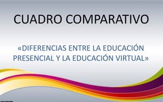 Este cuadro comparativo resume las principales diferencias entre la educación presencial y la educación virtual. En la educación presencial, el docente es el expositor central y controla el ritmo del grupo, mientras que en la educación virtual el docente actúa como facilitador y cada estudiante puede avanzar a su propio ritmo. Mientras la comunicación es predominantemente sincrónica en la educación presencial, en la educación virtual es tanto asíncrona como sincrónica. El aprendizaje en la educación presencial suele ser homog