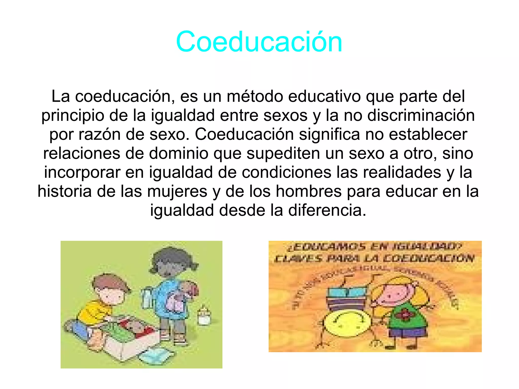 La coeducación parte del principio de igualdad entre sexos y no discriminación por sexo. Significa educar en igualdad de condiciones, incorporando las realidades e historias de mujeres y hombres.