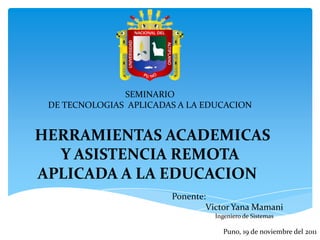 El seminario trata sobre herramientas tecnológicas aplicadas a la educación, incluyendo software para crear mapas conceptuales, presentaciones, videos tutoriales y compartir archivos. El orador, Victor Yana Mamani, explica el uso de herramientas como Cmap-Tools, Mindmanager, Camtasia Studio, TeamViewer y Skype para crear y compartir contenido educativo de forma remota.