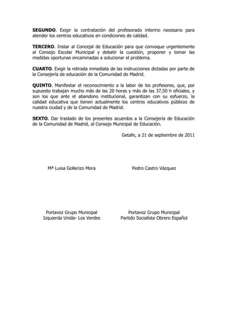 La Comunidad de Madrid recortó 3,000 profesores del sistema educativo público, un 15% de la plantilla, además de otros 2,000 el año anterior. Estos recortes perjudican la calidad de la educación pero no afectan a la educación privada. Los grupos municipales del PSOE e Izquierda Unida proponen apoyar las movilizaciones contra los recortes, exigir la contratación de profesores interinos y manifestar su apoyo al trabajo de los profesores.