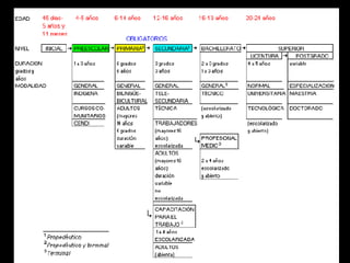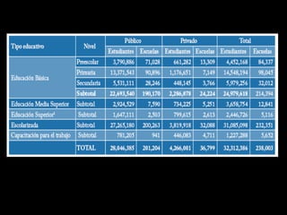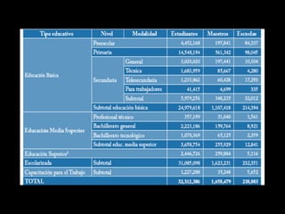 El documento describe la educación en México, incluyendo su historia, objetivos, niveles y organización. Cubre la educación preescolar, primaria, secundaria, media superior y superior, así como la educación especial, la Secretaría de Educación Pública y el Sindicato Nacional de Trabajadores de la Educación.