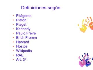 La educación ha sido definida de diversas formas a lo largo de la historia. Pitágoras la ve como templar el alma para las dificultades de la vida. Para Platón, la educación es un proceso que permite al hombre tomar conciencia de una realidad más plena y escapar del engaño a través de la razón y la educación. Piaget considera que la educación debe forjar individuos capaces de autonomía intelectual y moral que respeten esta autonomía en los demás.