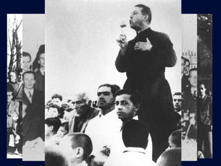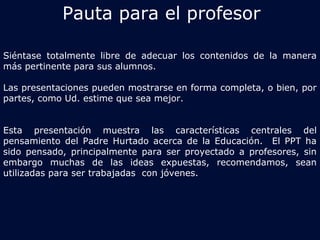 Este documento presenta una guía para profesores sobre cómo presentar el pensamiento educativo de San Alberto Hurtado. La guía sugiere adaptar el contenido a cada curso y revisar primero el esquema de la presentación. Además, propone generar diálogos y trabajar en grupo con preguntas extraídas de los escritos de Hurtado. El objetivo es enseñar a los jóvenes a vivir como Jesucristo a través de una educación del esfuerzo, la responsabilidad y el heroísmo.