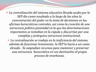 La descentralización del sistema educativo mexicano transfirió la responsabilidad de administrar la educación y los recursos a los estados, pero el gobierno federal mantuvo el control overall a través de evaluaciones. La descentralización buscó legitimar al gobierno y mantener el control, además de mejorar la eficiencia y las relaciones con el sindicato de maestros. Sin embargo, la autonomía de los estados siguió siendo limitada.