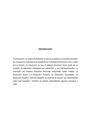 El documento presenta información sobre el sistema y sistema educativo dominicano. Explica que el sistema educativo está compuesto por cuatro niveles principales: educación inicial, primaria, secundaria y superior. Cada nivel tiene funciones específicas para contribuir al desarrollo integral de los estudiantes. También describe los principios y fines de la educación dominicana, incluyendo el derecho a una educación integral y el respeto a la vida y los derechos humanos.