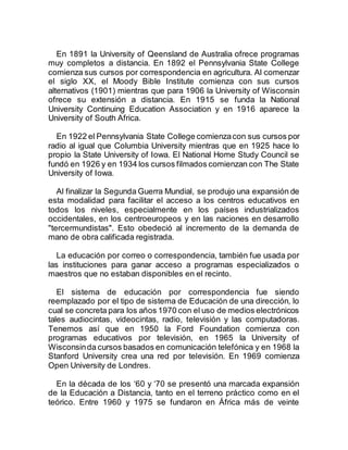 La educación a distancia es una forma de enseñanza en la que los estudiantes no necesitan asistir físicamente a clases, sino que reciben materiales de estudio por correo, correo electrónico u otras plataformas en línea. Se ha utilizado desde el siglo XVIII y ha evolucionado con el tiempo para incorporar nuevas tecnologías como la radio, la televisión y las computadoras. Actualmente, la educación a distancia ofrece flexibilidad y acceso a estudiantes que de otra forma no podrían asistir a clases presenciales