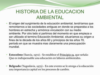 Este documento resume la historia y objetivos de la educación ambiental. Comienza describiendo los orígenes de la educación ambiental en sociedades antiguas y su surgimiento como concepto en la década de 1960. Luego detalla hitos clave como las conferencias de Estocolmo, Belgrado, Tbilisi y Río que promovieron la educación ambiental. Finalmente, enumera los objetivos de la educación ambiental como la toma de conciencia, adquisición de conocimientos, desarrollo de actitudes y aptitudes para abordar problemas ambientales.