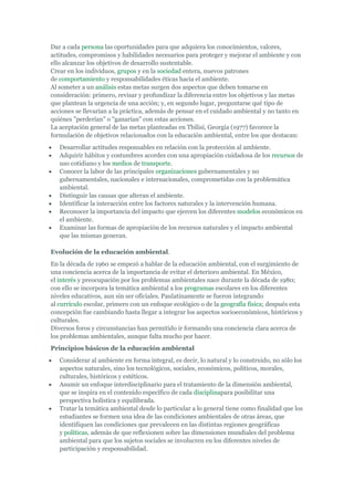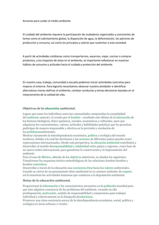 El documento habla sobre la importancia de la educación ambiental y las acciones que los ciudadanos pueden tomar para cuidar el medio ambiente. Describe que la educación ambiental busca que las personas comprendan la complejidad del ambiente natural y humano, y adquieran los conocimientos y habilidades para participar de manera responsable en la resolución de problemas ambientales. También destaca la necesidad de promover la cooperación internacional para abordar estos problemas, y que la educación ambiental debe cuestionar los modelos de desarrollo insostenibles que causan deterioro