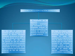 El documento resume los orígenes e historia de la educación ambiental. Explica que sus raíces se remontan a las sociedades antiguas, donde los hombres aprendían en estrecha vinculación con su medio ambiente. Sin embargo, el término "educación ambiental" surgió formalmente en la década de 1960-1970, cuando creció la preocupación mundial por el deterioro ambiental. Finalmente, destaca que a finales de los 1960 y principios de los 1970 la educación ambiental se consolidó como eje educativo, con el objetivo de conciliar las