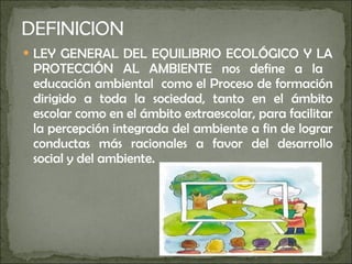 El documento habla sobre la educación ambiental y el ecoturismo. Define la educación ambiental como un proceso de formación dirigido a toda la sociedad para facilitar la percepción del ambiente y lograr conductas que favorezcan el desarrollo sostenible. También describe algunos principios del ecoturismo como viajar a áreas naturales sin perturbarlas y apreciar la naturaleza y cultura locales de manera respetuosa. Menciona algunos ejemplos de destinos ecoturísticos en México.