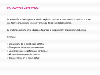 La educación artística permite el desarrollo integral de las personas mediante la sensibilidad estética, los procesos creativos y la ampliación de las capacidades individuales. Favorece la comprensión de la belleza y alcanzar competencias básicas. Se presentan cuatro modelos de educación artística: basado en procesos técnicos, la autoexpresión, el desarrollo de la percepción visual y la comprensión crítica de la cultura.