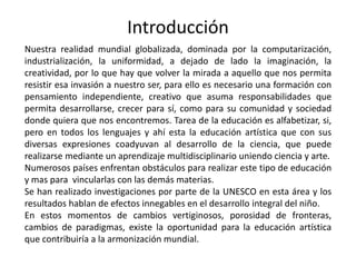 La educación artística es importante para el desarrollo integral de los niños, pero actualmente se enfrenta a varios obstáculos. En muchos países se le da poca prioridad y recursos, y los maestros a menudo carecen de capacitación adecuada. Sin embargo, cuando se enseña bien, la educación artística puede mejorar el aprendizaje en otras materias y fomentar la creatividad. Se necesitan esfuerzos continuos para superar las barreras y maximizar los beneficios de incluir las artes en la educación.