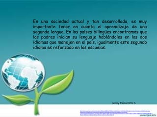 El documento discute la importancia del bilingüismo en la sociedad actual. En países bilingües, los padres suelen hablarles a los niños en ambos idiomas desde pequeños. Aprender un segundo idioma mejora la atención y es importante para la competitividad laboral. Sin embargo, en algunos países latinoamericanos existen barreras para el aprendizaje de segundas lenguas entre grupos indígenas.