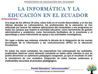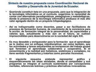 Este documento discute la integración de la tecnología informática y las comunicaciones (TIC) en la educación ecuatoriana. Propone usar la investigación como una estrategia metodológica de aprendizaje que permita aprovechar el potencial de las TIC de una manera pedagógicamente sólida. También recomienda el aprendizaje cooperativo y por proyectos para desarrollar habilidades de aprendizaje autónomo y crítico en los estudiantes.