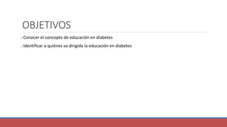 Este documento describe la educación en diabetes, sus objetivos y beneficios. Explica que la educación en diabetes es un proceso interactivo que ayuda a las personas con diabetes a adquirir conocimientos y habilidades para manejar su condición. Señala que la educación estructurada, impartida por educadores capacitados y con garantía de calidad, tiene beneficios como mejor control glucémico y resultados psicológicos. Además, destaca la importancia de proporcionar educación en diabetes acorde a la edad y utilizando nuevas tecnolog