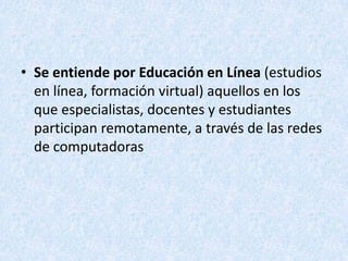 Este documento habla sobre la educación en línea. Define la educación en línea como aquella en la que especialistas, docentes y estudiantes participan de forma remota a través de redes de computadoras. Explica que la educación interactiva a distancia se basa en la teleformación, que usa tecnologías de información y comunicación. Además, señala que los estudiantes de clases virtuales obtuvieron mejores resultados en las pruebas que los estudiantes presenciales.