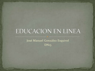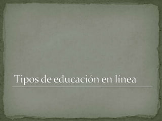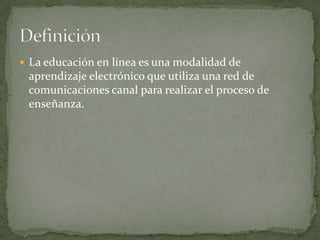 La educación en línea utiliza redes de comunicación para enseñar de manera remota, ya sea de forma sincrónica mediante videoconferencias o de forma asíncrona a través de foros y correo electrónico. Esto permite a los estudiantes tener flexibilidad en el tiempo, espacio, ritmo y forma de aprendizaje, mientras el profesor actúa como guía. La educación en línea también promueve el aprendizaje colaborativo a través de herramientas en Internet y ofrece una evaluación integral del desempeño de los