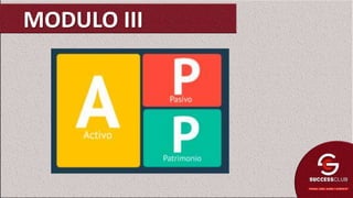 Este documento resume los conceptos básicos de activos, pasivos y patrimonio en 3 módulos de educación financiera. Los activos son los recursos y bienes que generan ingresos, como sueldos o alquileres. Los pasivos son las deudas que requieren pagos como préstamos o servicios. El patrimonio es el capital acumulado como resultado de los ingresos y pérdidas a lo largo del tiempo en bienes como casas o ahorros. Se enfatiza la importancia de planificar las finanzas personales y familiares, minimizar