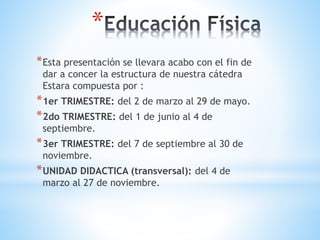 Este documento presenta la estructura de una cátedra de educación física dividida en tres trimestres. Cada trimestre se centra en habilidades específicas como manipulación de pelotas, pases, lanzamientos, defensa y juego colectivo. Además, hay una unidad didáctica transversal que cubre temas como el cuerpo humano, la salud, actitudes y conceptos.