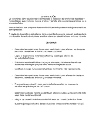 Este documento presenta los planes de estudio de educación física para los grados primero, segundo y tercero. Incluye la justificación, objetivos, contenidos, metodología y criterios de evaluación para cada grado. El objetivo general es desarrollar las capacidades físicas, motrices y hábitos de vida saludable en los estudiantes a través de actividades como ejercicios, juegos, deportes y danzas.