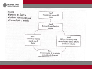 El documento presenta los principios de la educación inclusiva según la Declaración de Salamanca de 1994. Establece que (1) cada niño tiene características únicas y necesidades de aprendizaje propias que deben ser consideradas, (2) los sistemas educativos deben estar diseñados para satisfacer toda la gama de necesidades de los estudiantes, y (3) las personas con necesidades educativas especiales deben tener acceso a las escuelas regulares a través de una pedagogía centrada en el estudiante.