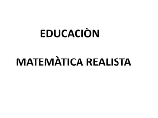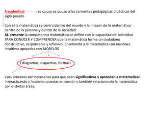 Este documento describe la matemática realista de Freudenthal, la cual se centra en darle sentido común a la matemática relacionándola con el mundo real del estudiante a través de modelos, diagramas y esquemas. La enseñanza busca desarrollar habilidades como descubrir, reflexionar y resolver problemas de manera guiada, poniendo al estudiante en contextos significativos mediante la fenomenología didáctica.
