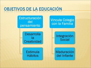 Este documento presenta los tres tipos de educación: la educación formal que se refiere a la enseñanza en escuelas, institutos y universidades; la educación no formal que incluye cursos y academias; y la educación informal que abarca ambos tipos anteriores y se adquiere a lo largo de la vida a través de la transmisión de conocimientos, valores y costumbres.