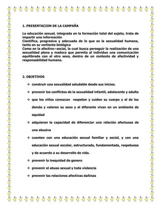 Este documento trata sobre la importancia de la educación sexual en niños de 4 a 10 años. Propone construir una sexualidad saludable desde temprana edad mediante el conocimiento de su propio cuerpo, el respeto hacia otros y la prevención de abusos. También enfatiza el rol fundamental de los padres en esta educación a través de la comunicación, el monitoreo del entorno del niño y la respuesta a sus preguntas con naturalidad.
