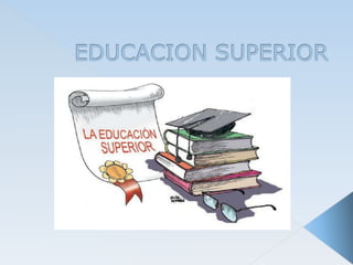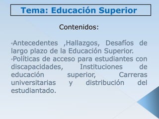 El documento habla sobre la educación superior en 3 oraciones o menos. Aborda el desarrollo curricular, el perfil docente y estudiantil, los derechos de las personas con discapacidad en la ley de educación superior, e incluye universidades de investigación e institutos técnicos y tecnológicos como tipos de instituciones de educación superior.