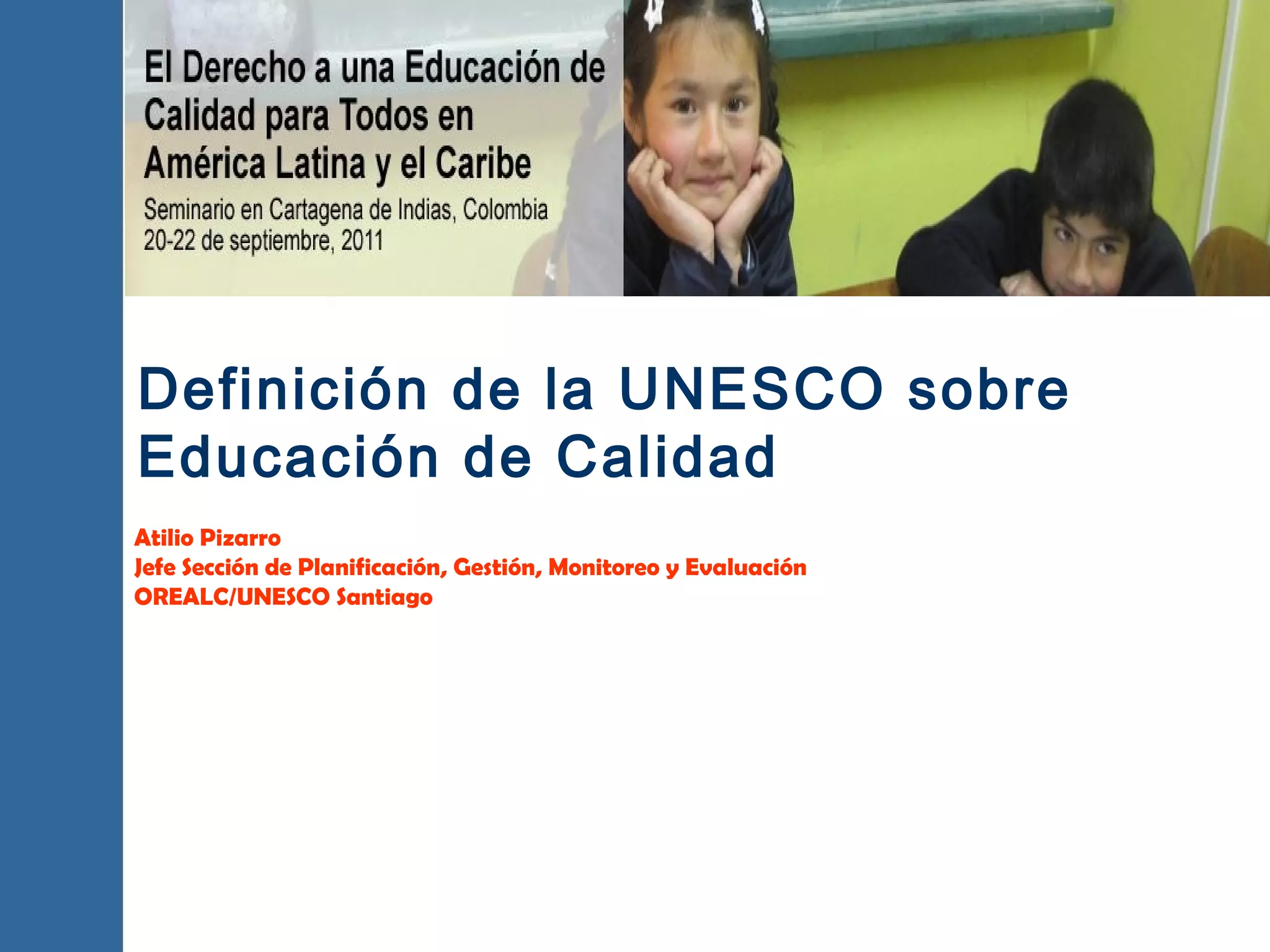 El documento discute la definición de educación de calidad de la UNESCO y los compromisos internacionales en educación como los Objetivos de Desarrollo del Milenio. Se enfoca en los desafíos continuos de mejorar la calidad de la educación y lograr la equidad educativa, particularmente en América Latina y el Caribe. También examina los enfoques de derechos humanos para una educación inclusiva y de calidad para todos.
