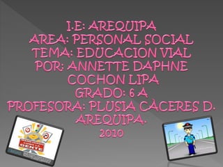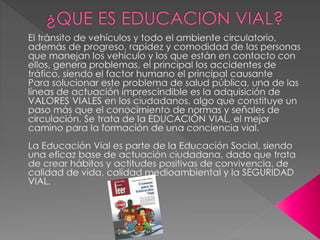 La educación vial es difícil de lograr en las comunidades y requiere un esfuerzo coordinado de las asociaciones, familias y cuidadores. Todos debemos ser buenos modelos e impulsar el aprendizaje sobre el uso responsable de los espacios públicos. Las señales de tránsito guían a conductores y peatones sobre las normas de tránsito usando símbolos universales. Existen diferentes tipos de señales como verticales, horizontales y luminosas, que cumplen funciones de regulación, prevención e información.