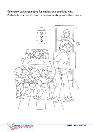El documento presenta una serie de actividades para enseñar normas de seguridad vial a niños de 4 años, incluyendo pegar papeles de colores en un semáforo, colorear y conversar sobre las reglas para cruzar la calle de forma segura, identificar a peatones que no respetan las normas, y comentar y colorear imágenes para practicar el comportamiento adecuado.