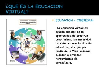 Este documento describe la educación virtual y sus características. La educación virtual permite construir conocimiento a través de internet sin necesidad de asistir a una institución educativa. Se caracteriza por permitir la personalización del aprendizaje, la interactividad y la conectividad. Ofrece mayor compromiso y autonomía de los estudiantes, pero también puede llevar a la pasividad. Las aulas virtuales son espacios en línea donde los estudiantes encuentran contenidos y actividades de forma similar a un salón de clases tradicional.