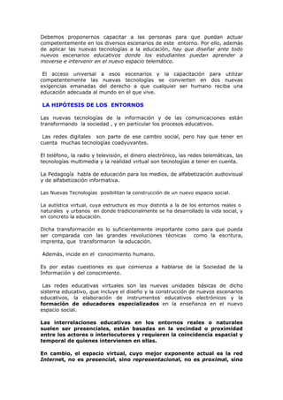 El documento describe la educación virtual como un nuevo entorno social creado por las nuevas tecnologías que permite nuevos procesos de aprendizaje a través de redes de comunicación. Este entorno requiere nuevos conocimientos y habilidades que deben ser enseñados a través de sistemas educativos adaptados, incluyendo escuelas a distancia y en red. El autor argumenta que la estructura del espacio virtual es diferente a los entornos tradicionales presenciales, por lo que se necesitan nuevos escenarios y métodos educat